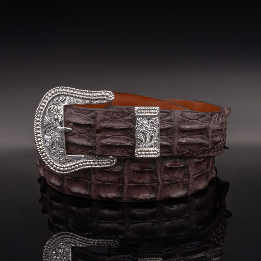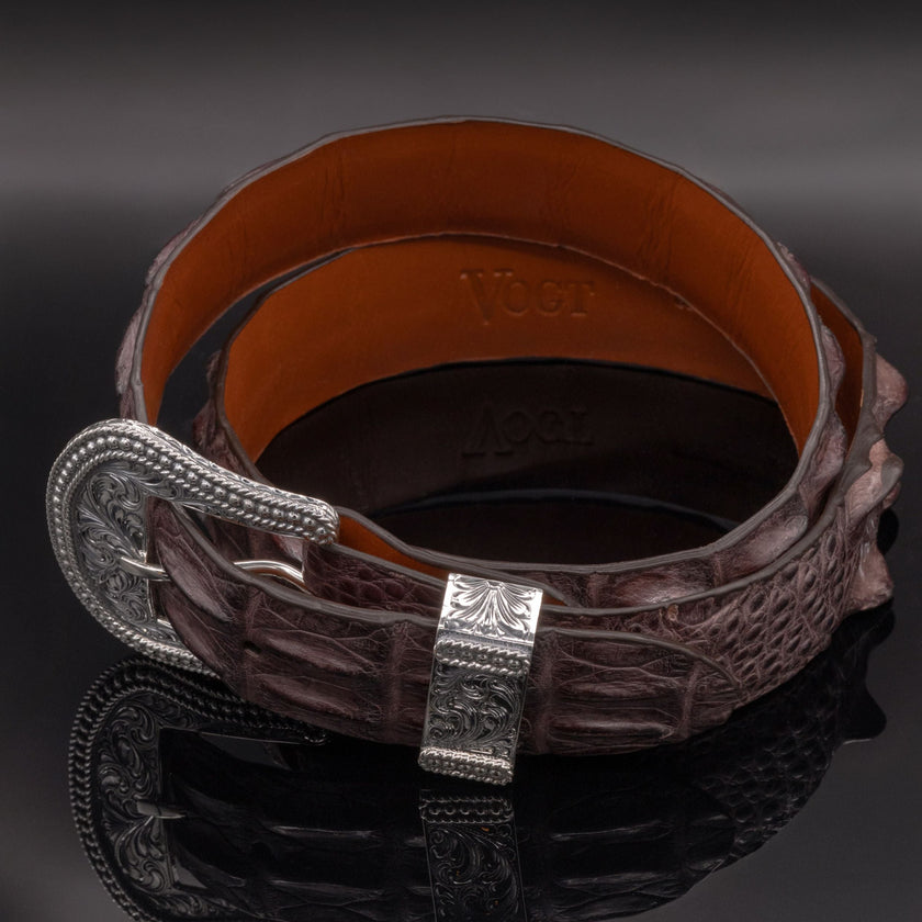 This 1 1/2" sterling silver buckle set features a distinctive design with an antiqued, hand-engraved base, hand-twisted sterling rope, and beaded edges. The flat, hand-cut buckle silhouette completes the look.