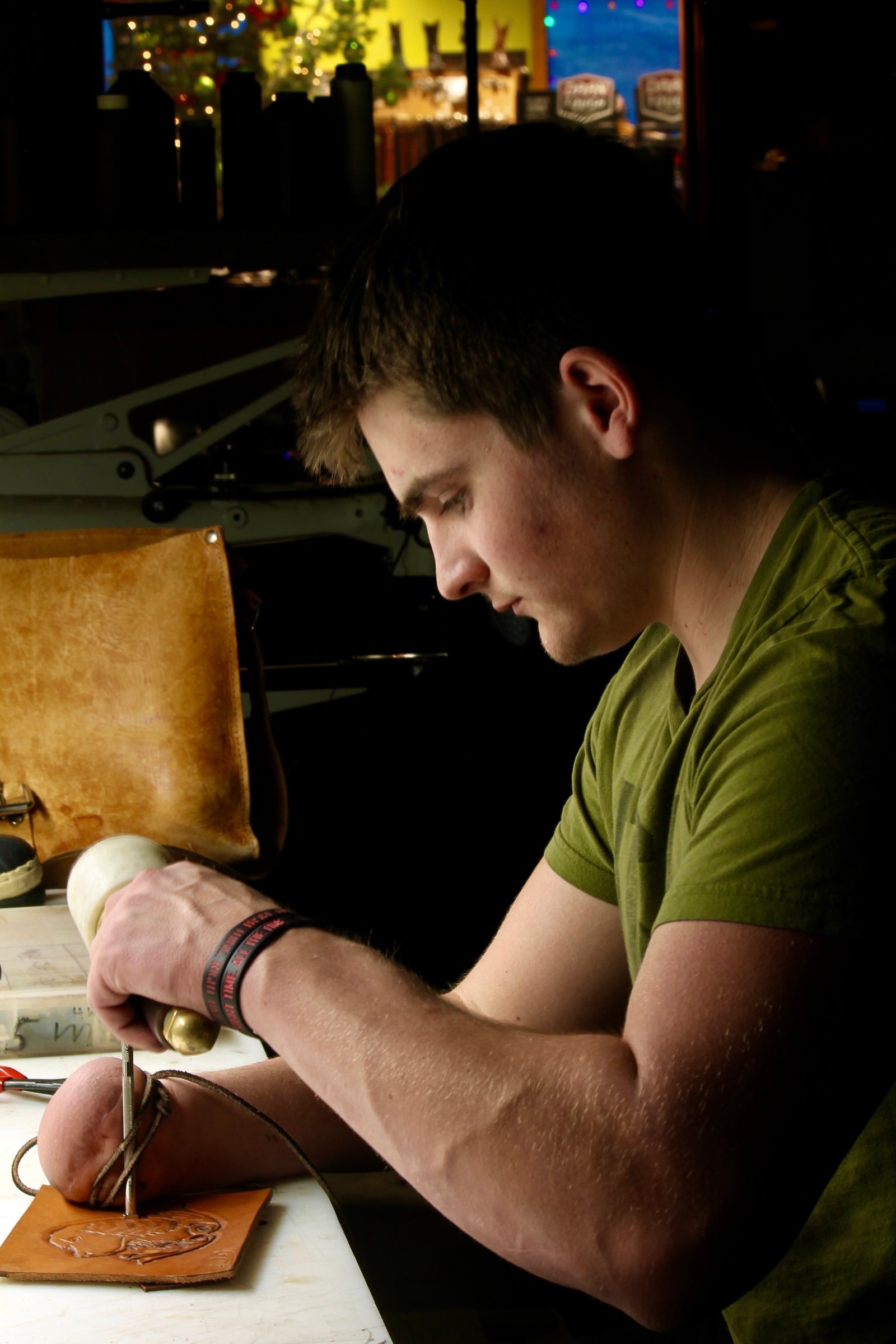 I have worked for Carter's since I was 14 years old. I am a student at Montana State University. Despite having only one hand, I independently acquired skills in leatherwork, specializing in traditional Western-style carving and restoration since the age of 12. I honed my craft in the confines of my garage, entirely self-taught. One day, at the age of 14, while visiting Carter's to purchase leather, I received a job offer from Garrett and Jeff. Now, at 19, I continue to thrive in my role.