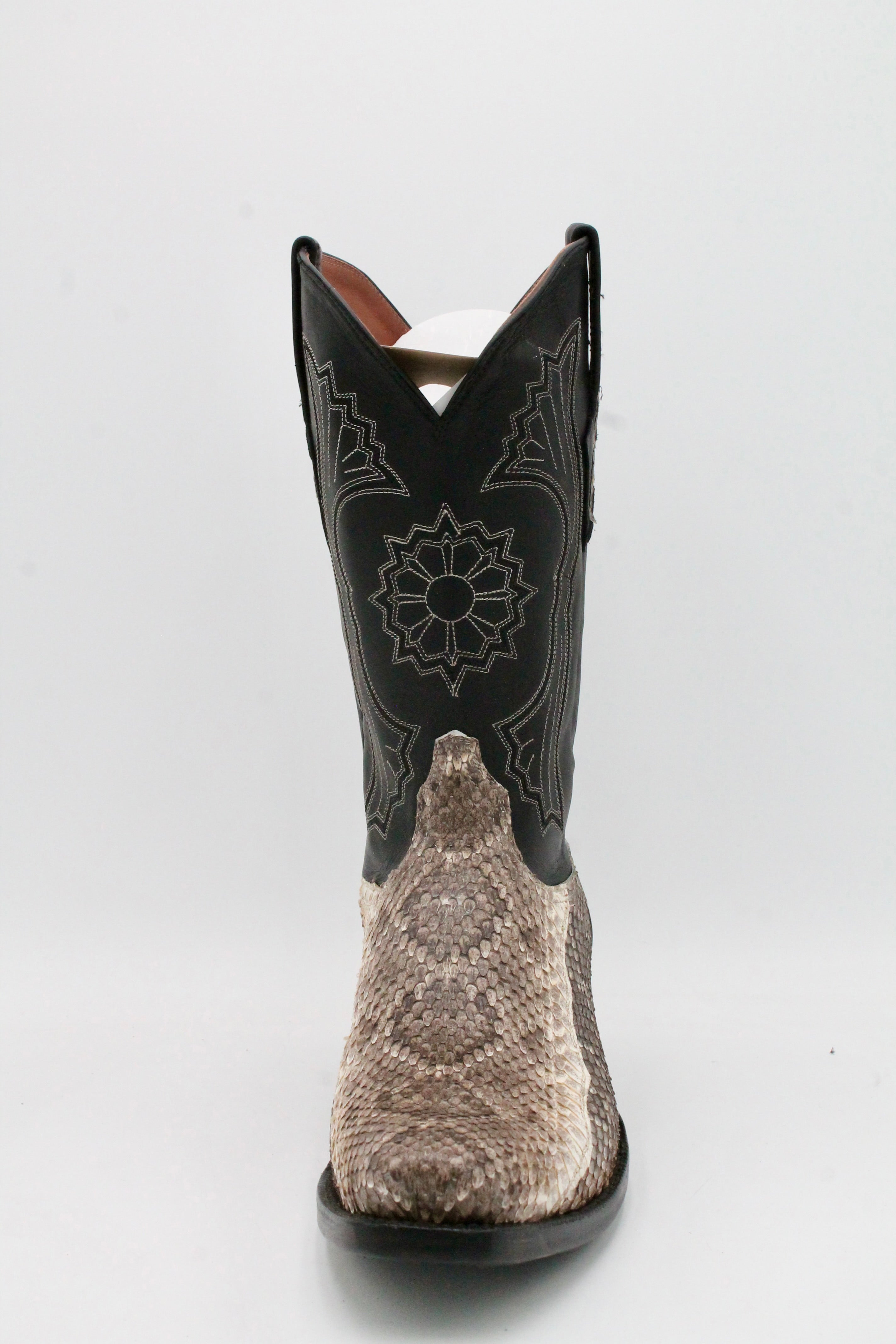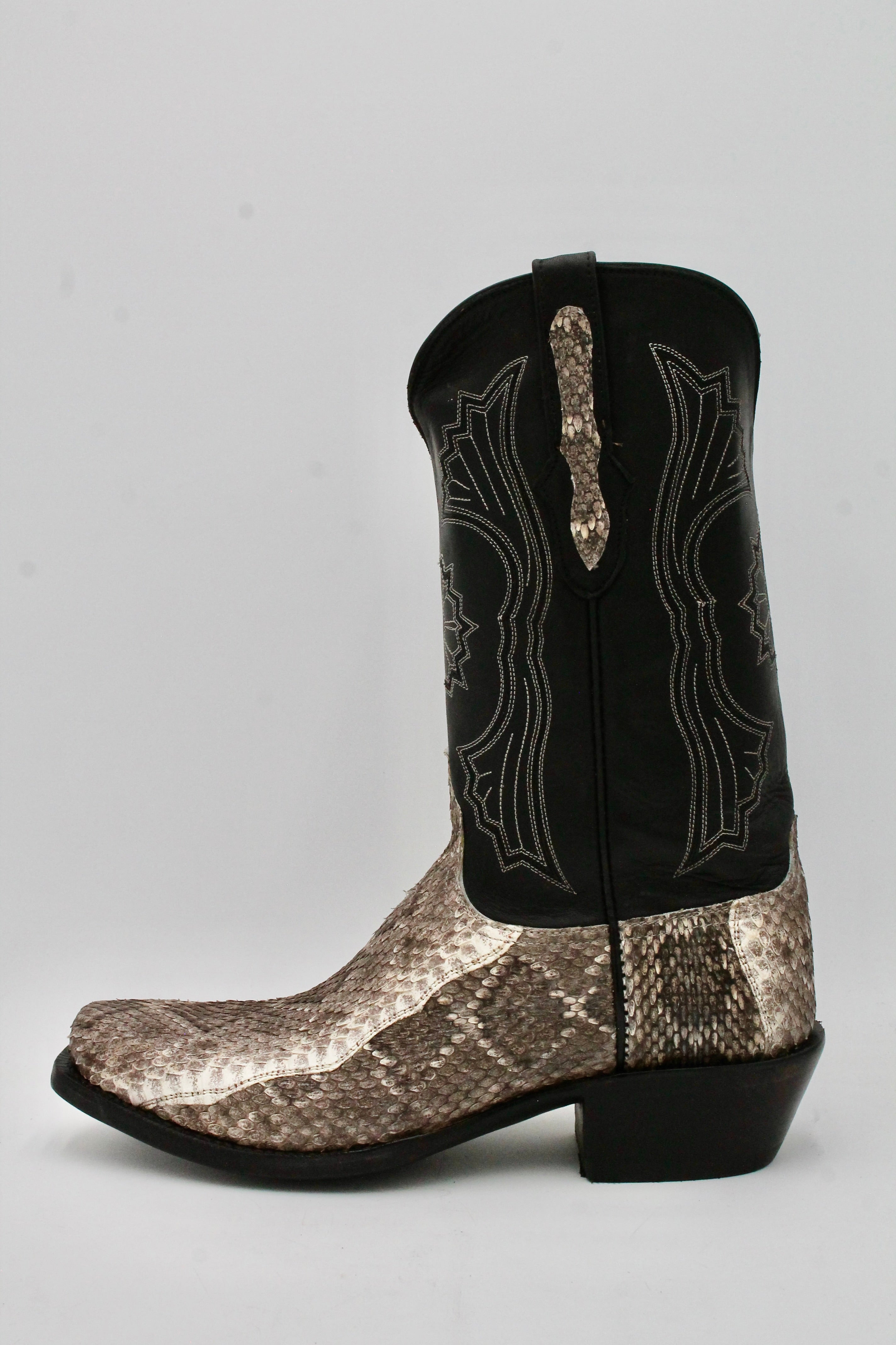 These Black Jack Boots are expertly handcrafted in El Paso, Texas, with a focus on exceptional quality and craftsmanship. We offer all standard sizes and can accommodate changes to the toe and heel shapes to suit your preferences. Please note that, due to the unique nature of rattlesnake hide, the appearance of the skin will vary from boot to boot. We have no way of sending images of the hides prior to production. Production and delivery typically take between 12 to 16 months, depending on material availability.